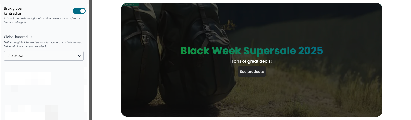 In the image below the hero banner has global radius active with the value RADIUS-3XL