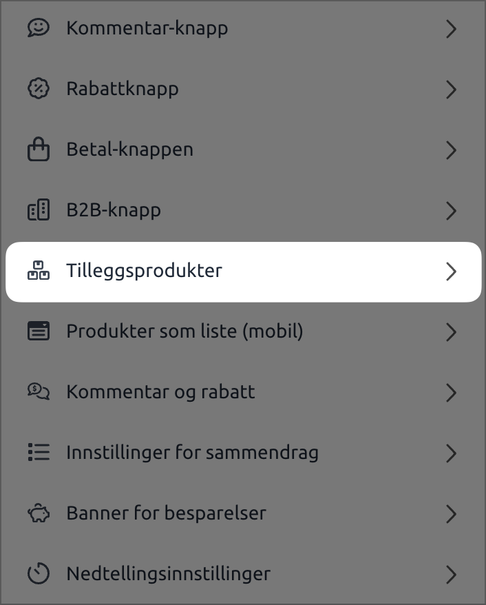 Her finner man så alle innstillinger for "Tilleggsprodukter" gruppert.