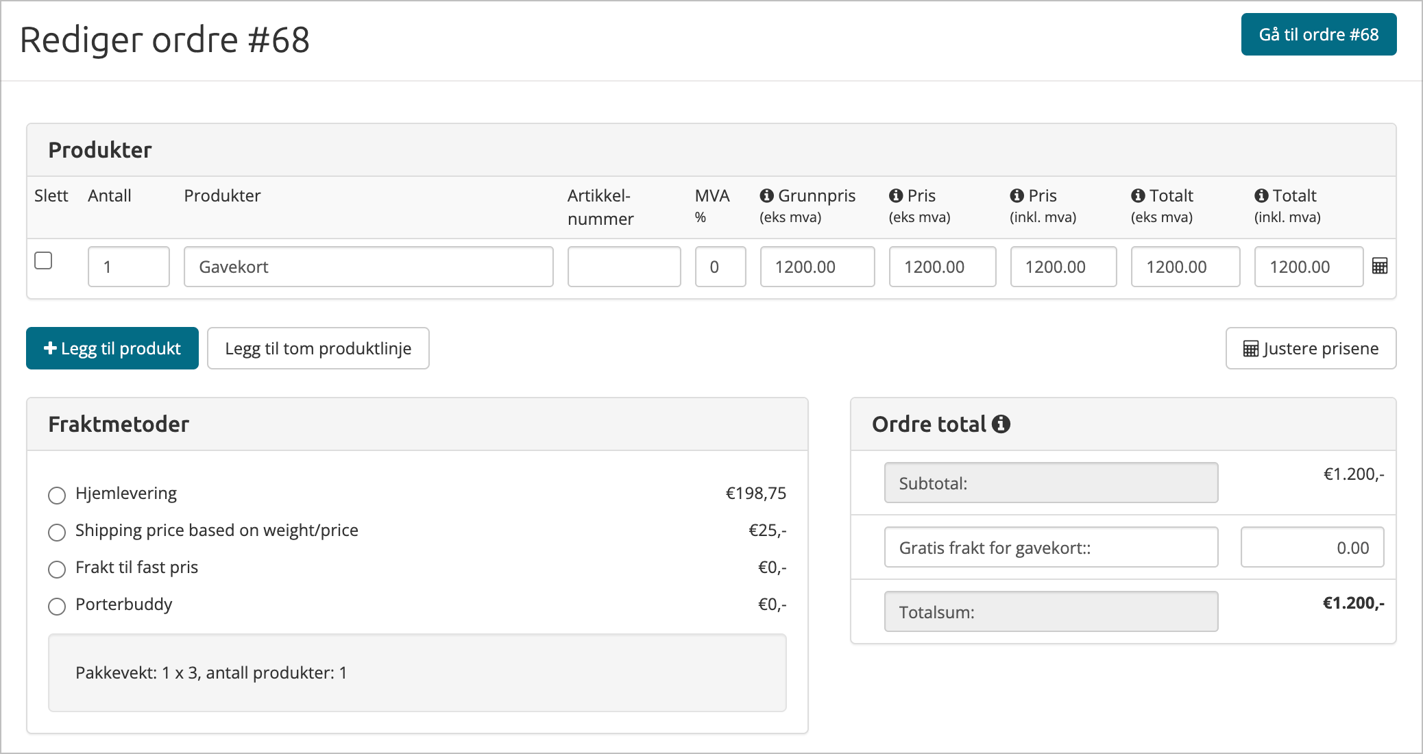 Pris på fraktmetoden kan endret i seksjonen "Ordre total".