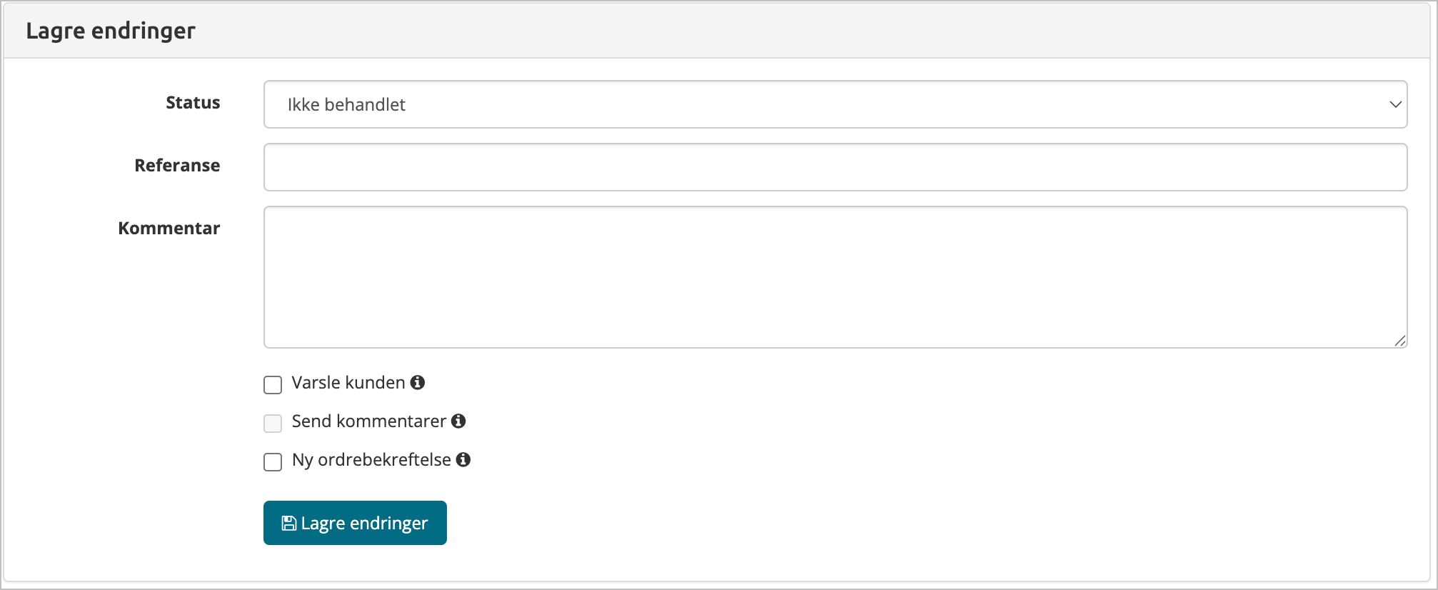 Ved lagring av endringer kan du også oppdatere status, referanse og kommentar. I tillegg er det valg for å varsle kunde samt sende en ny og oppdatert ordrebekreftelse.